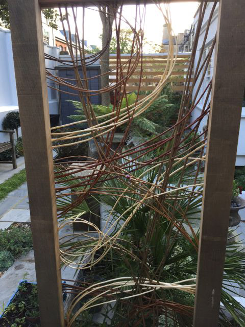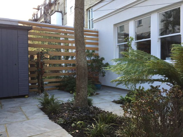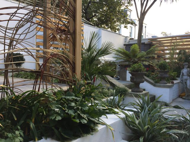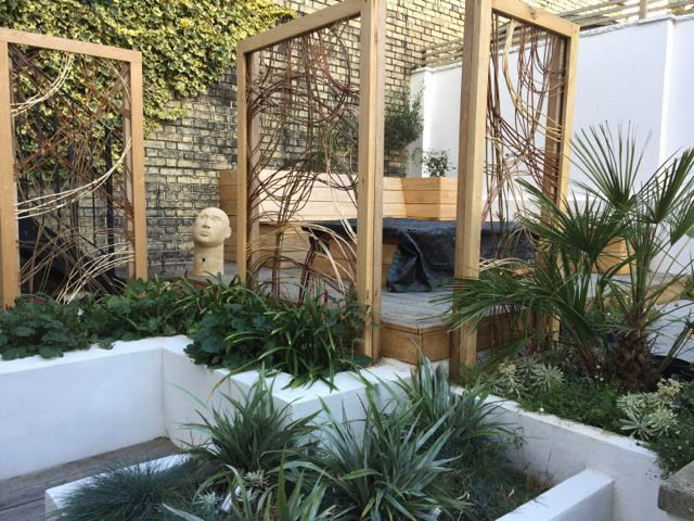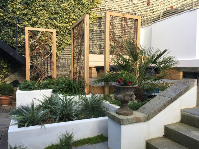 A Brighton flat with an overlooked terraced garden. The clients, one a basket weaver and the other a keen gardener wanted a larger, partially concealed eating area and plenty of beds for plants.