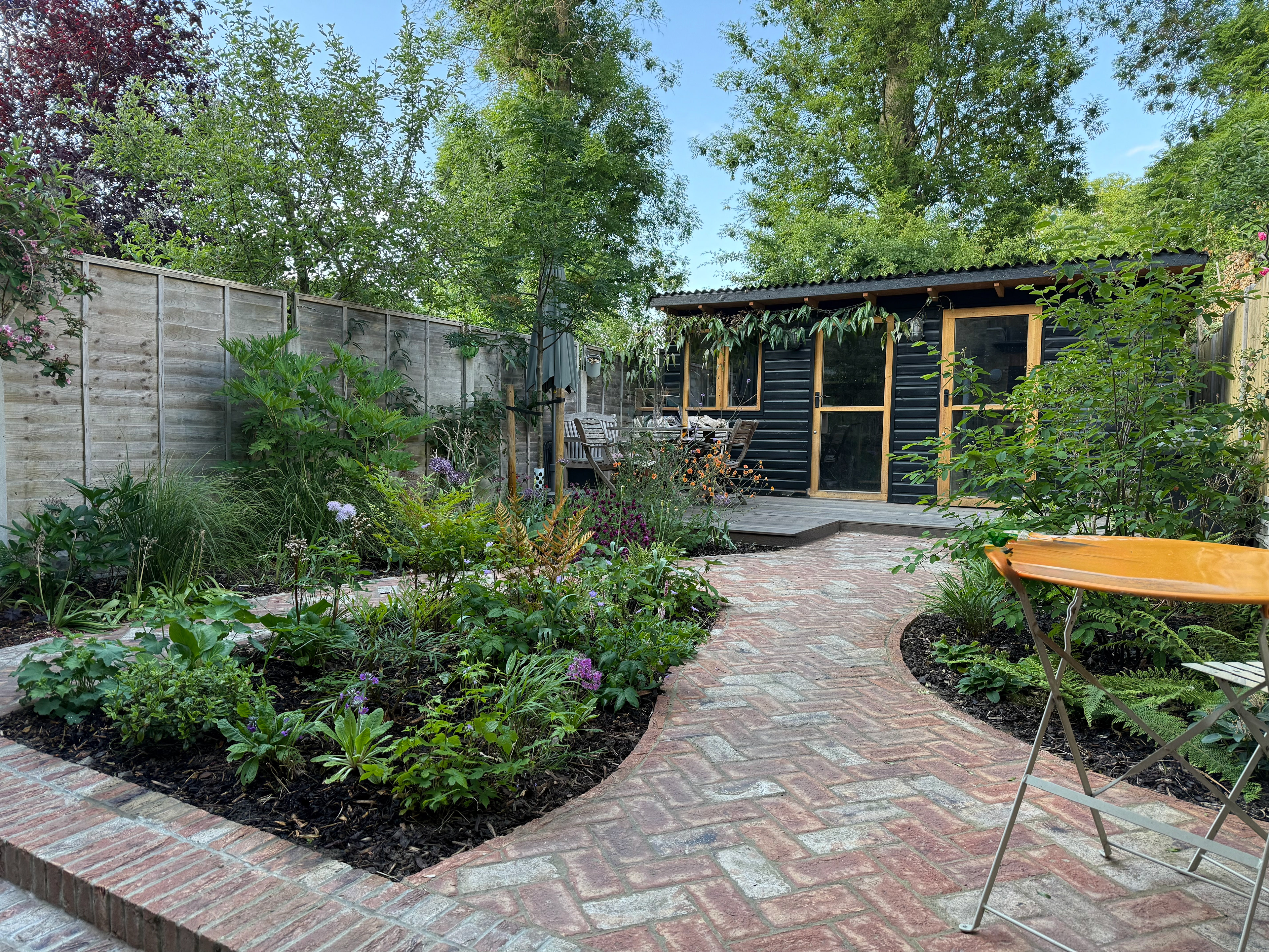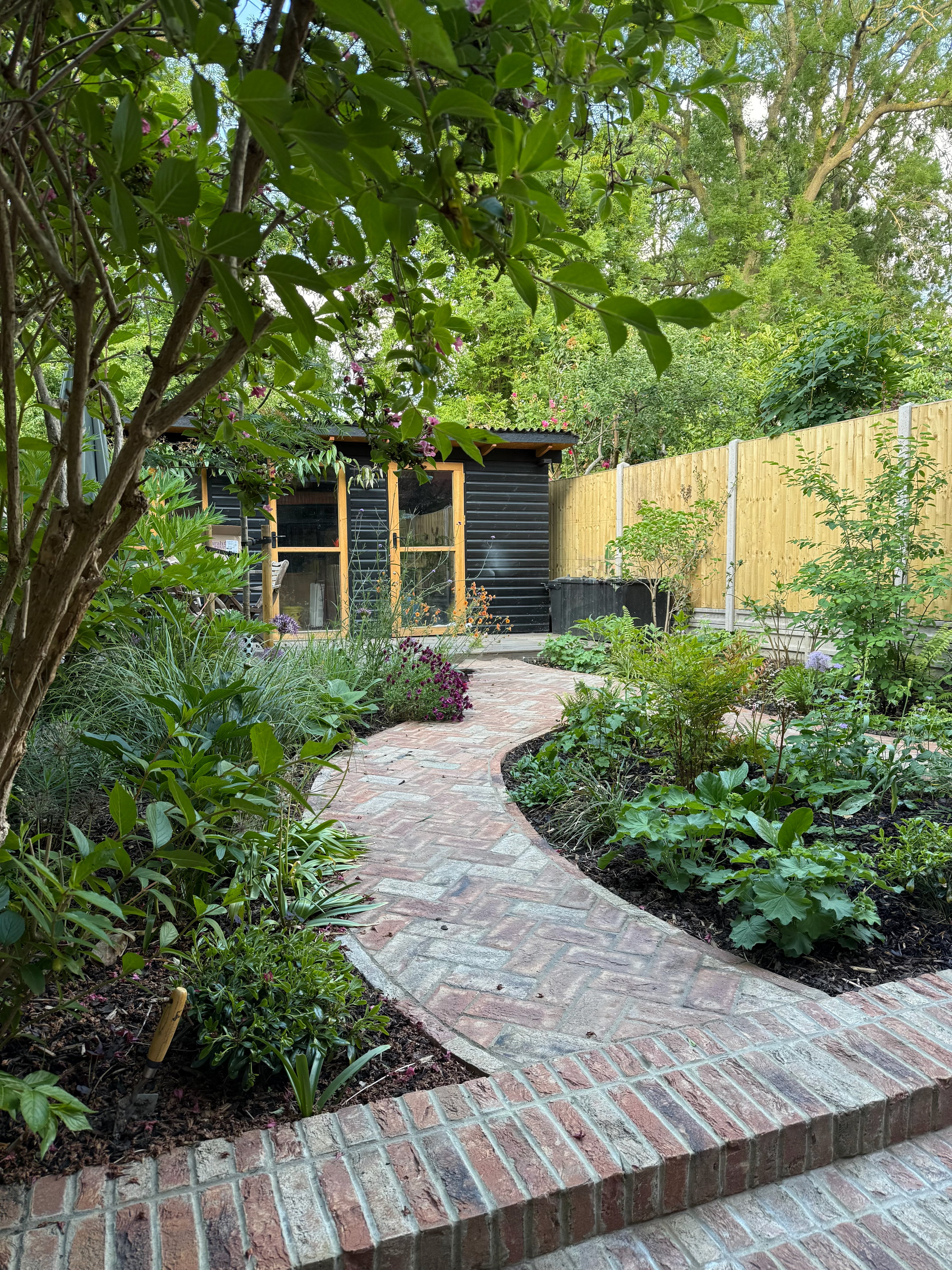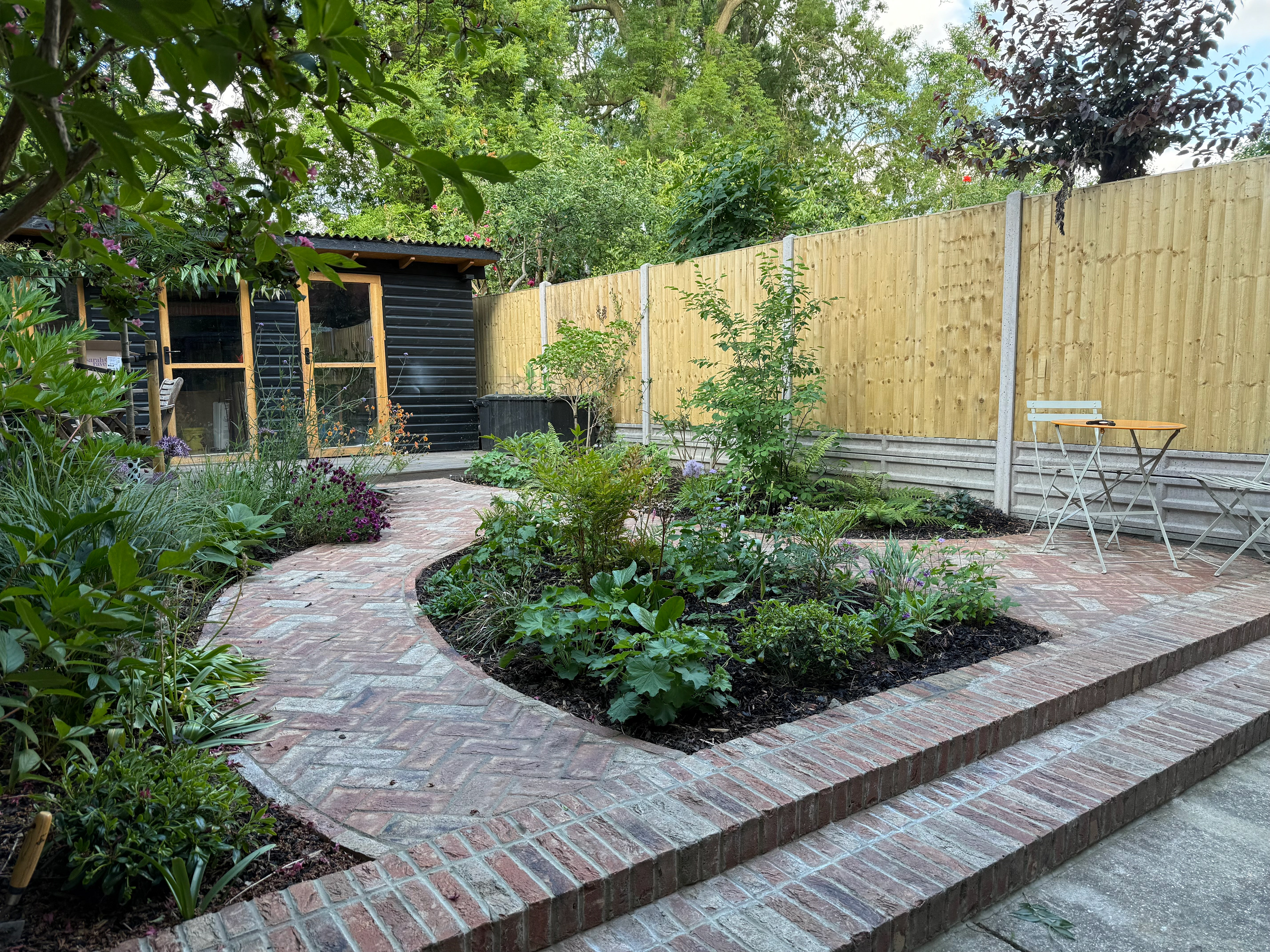 Two creative industry client's required a garden that could accommodate their need to commute up and down their garden from the house to the garden studio's with their beautiful handmade products, (a Dalek being one ....yes, as in Doctor Who) & 'without getting their ankles wet'!