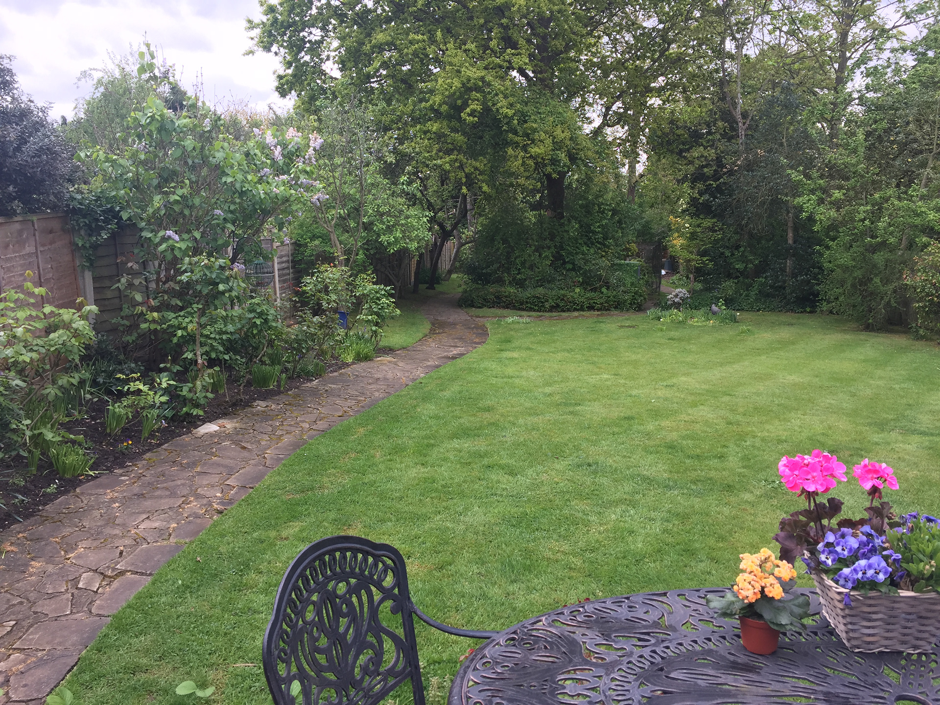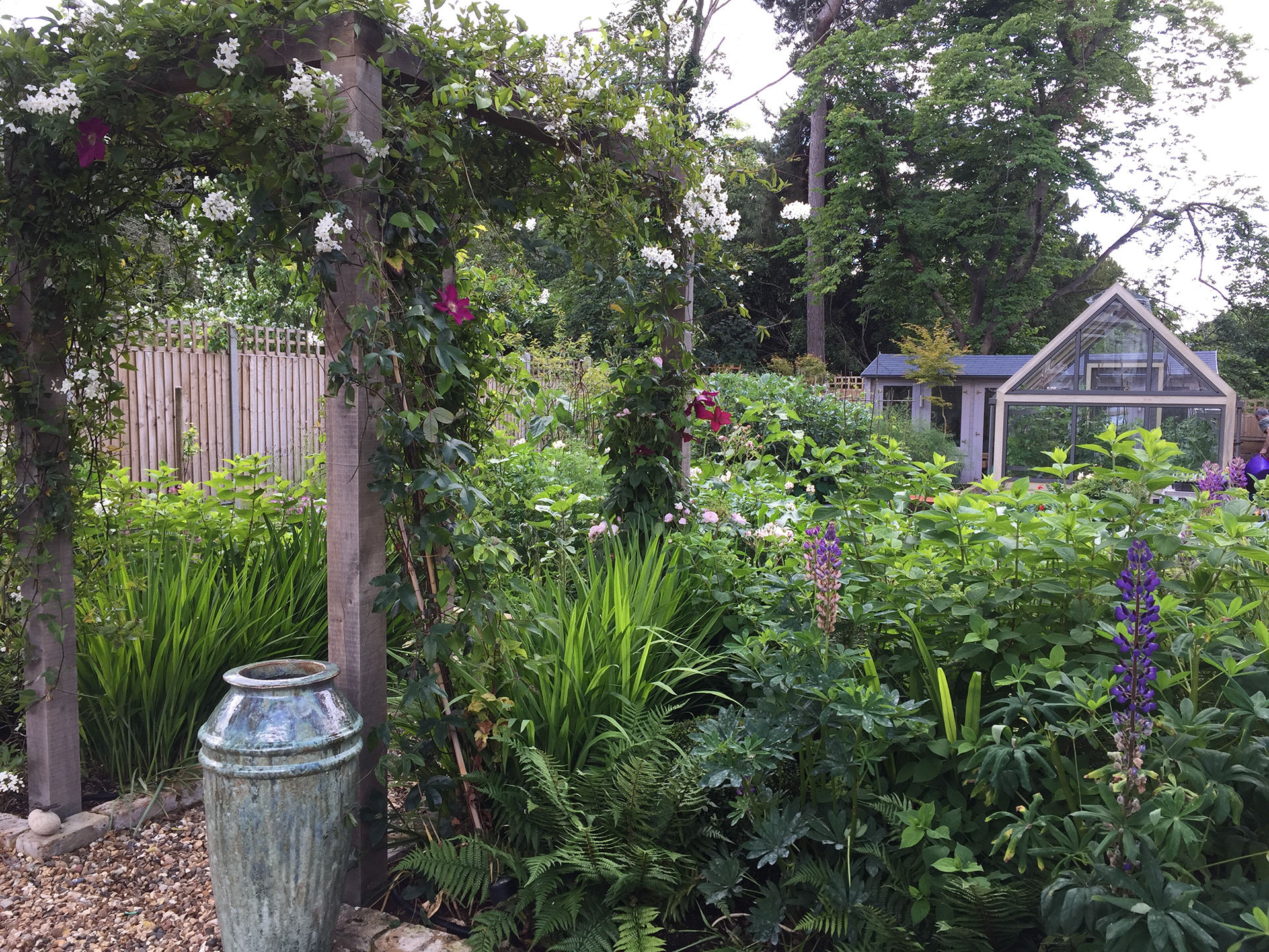 The clients of this expansive garden provided a precise and detailed brief, outlining their vision for a multifunctional outdoor space. Their desires included the transformation of a sloping lawn into a leveled area for croquet, extension of the terrace to accommodate a sizable dining table and seating arrangement, installation of a swing seat for sunset views, creation of a substantial vegetable garden with a greenhouse and storage shed, incorporation of a pergola, introduction of seasonal plantings, provision for a fire pit, trampoline, and even a dedicated space for chickens. The clients had already acquired two beautiful urns, which served as the initial inspiration for the garden's design.