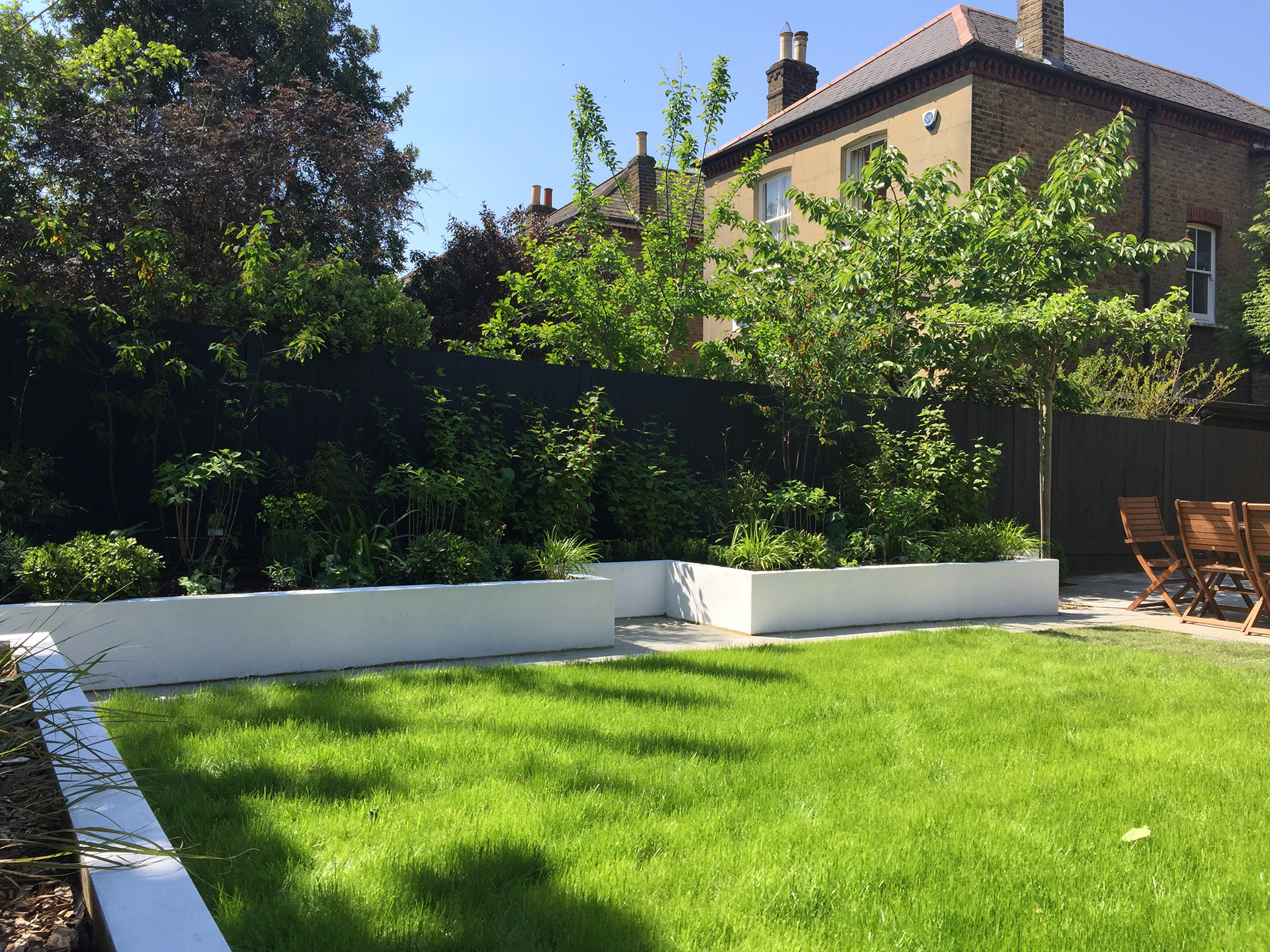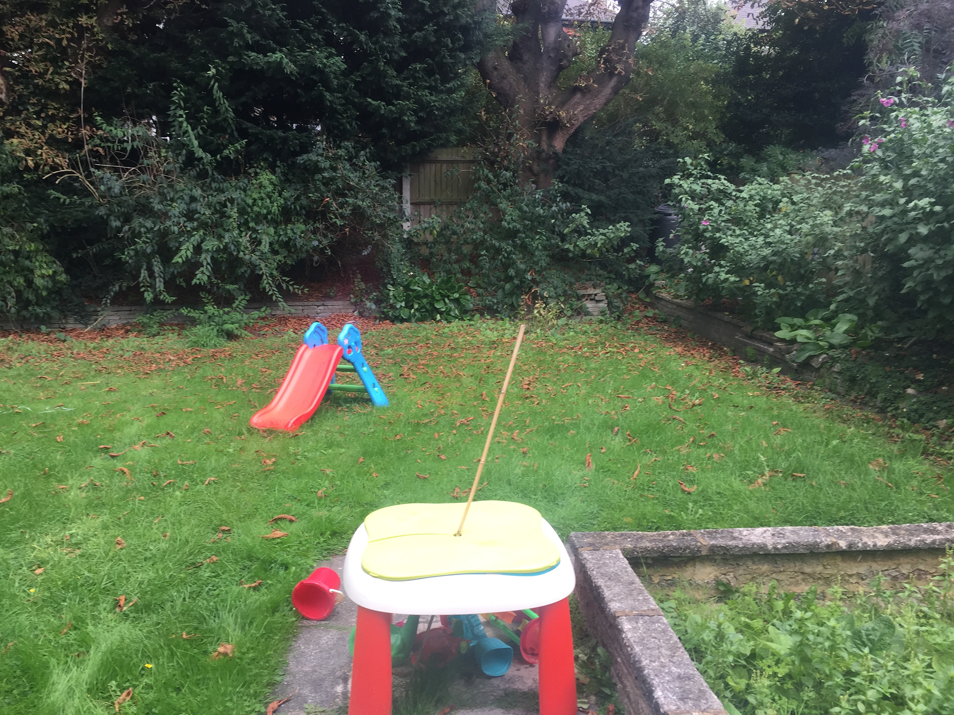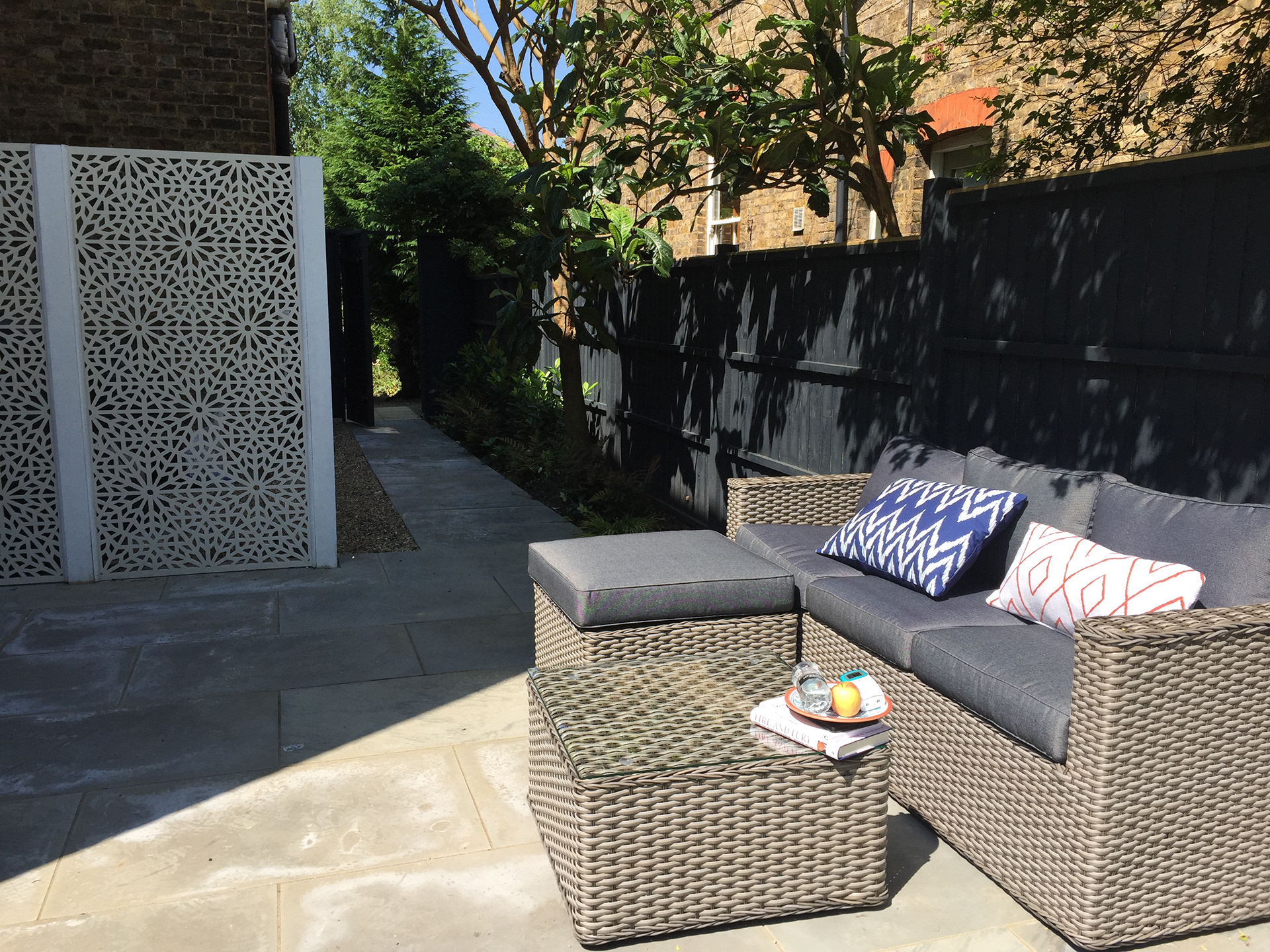 Two large horse chestnut trees dominated the garden, leading to a strategic design that kept the areas beneath them low-maintenance and open for children to freely explore. Future plans included the addition of a playhouse in this space. To enhance the overall functionality, a screen was introduced to the side of the house, lightening the space and creating a designated area for toy storage.