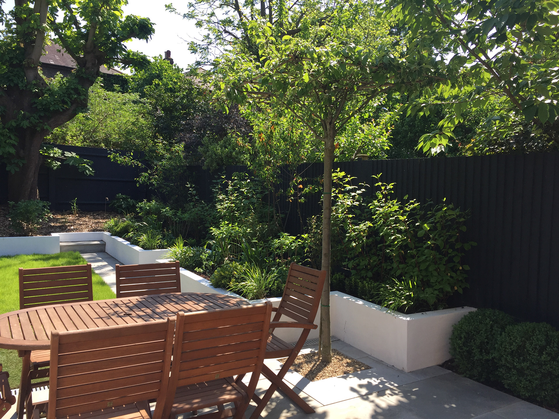 For the paved section, Khandler grey sawn sandstone was chosen, providing a visually appealing and durable surface. The introduction of a pleached apple tree not only added aesthetic interest but also created dappled shade over the dining area. The planting scheme featured a mix of Hydrangea paniculata 'Limelight,' Astrantia, Agapanthus africanus, and Pittosporum tobira 'nanum,' contributing to a varied and visually engaging garden.